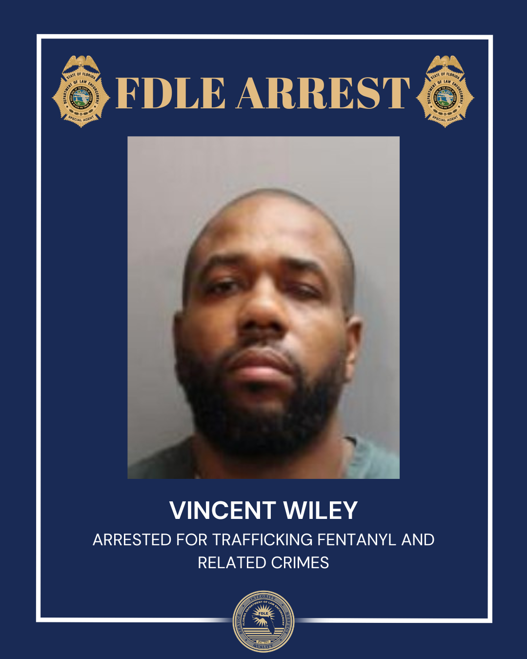 On Jan. 29, FDLE, with the assistance of the Florida Highway Patrol, arrested Wiley following a traffic stop. Agents also served a search warrant on his residence and FDLE agents seized large quantities of drugs, cash and firearms.
